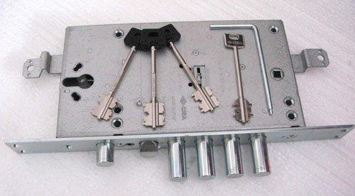 - верхний механизм: сувальдный, четыре ригеля диаметром 18мм, вылет 38 мм, управляет ригелями вертикального запирания, четыре полуоборота ключа, система NEW CAMBIO FACILE (5 ключей + ключ для строителя) позволяет заменять ключи, не прибегая к демонтажу замка или какой-либо его части, а используя только специальный инструмент и ключи